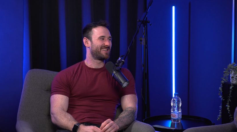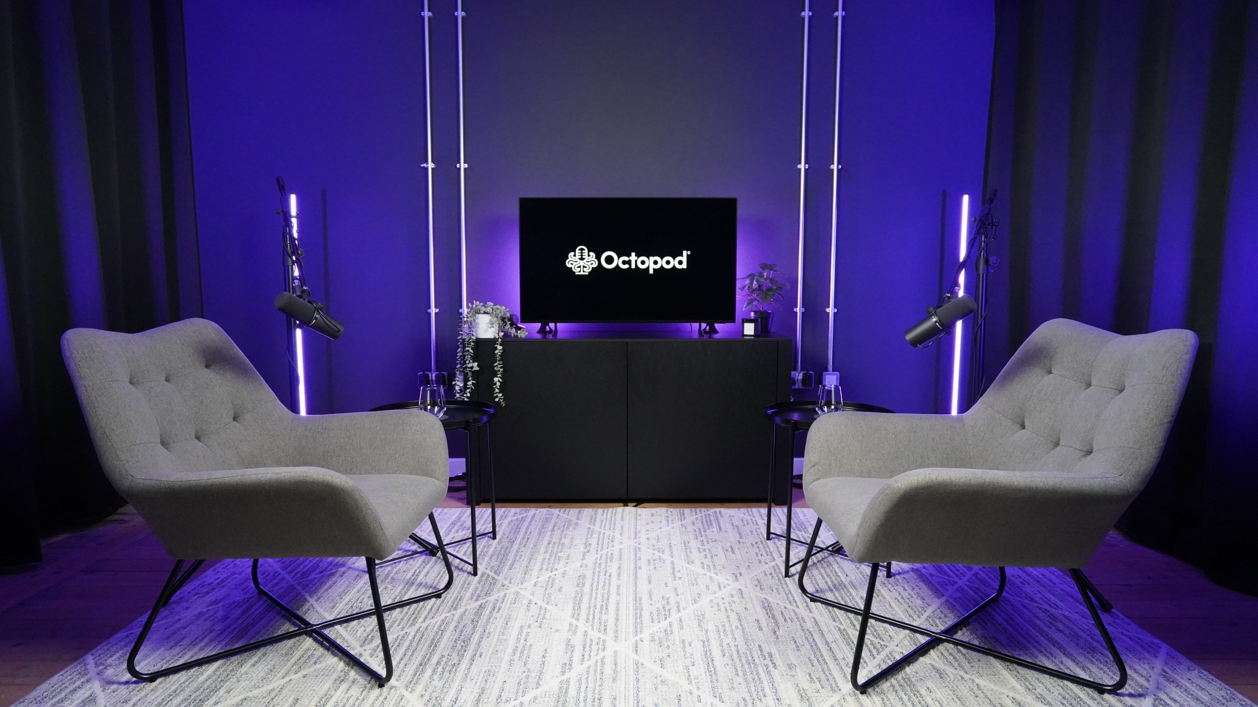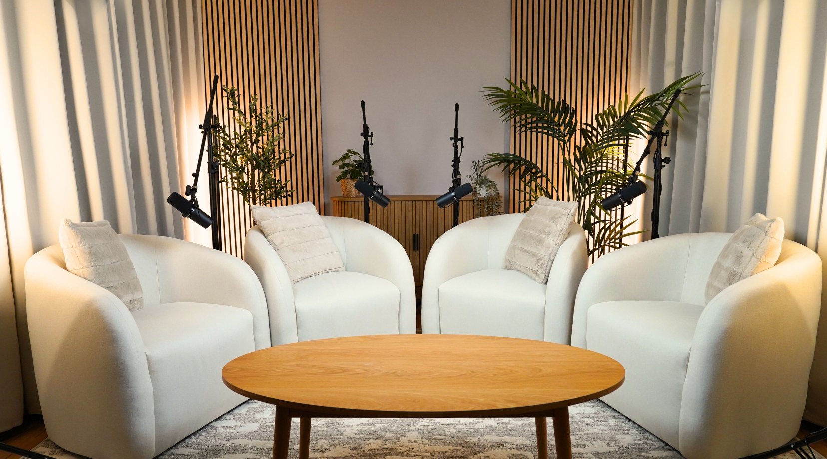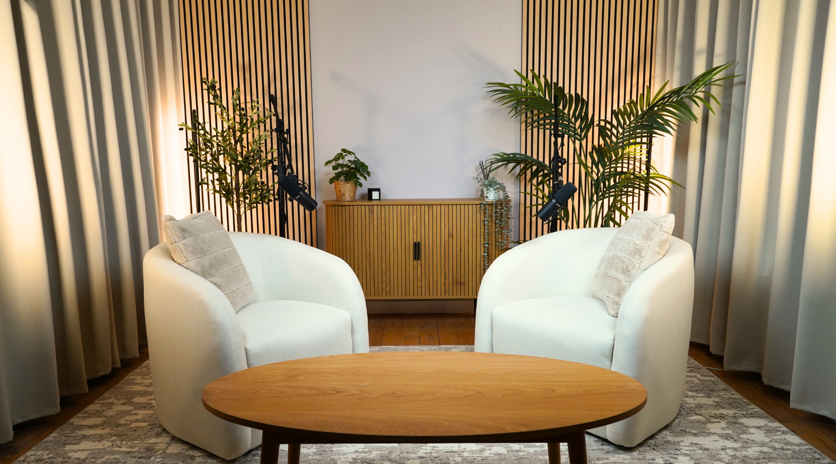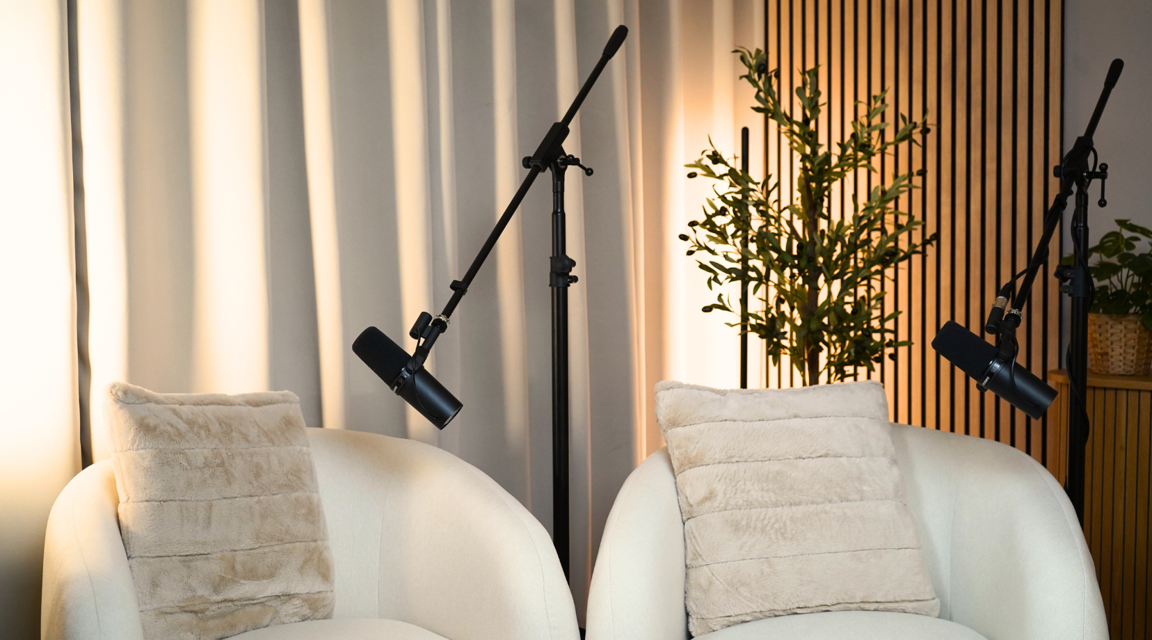 Microphone stands positioned for clean interview capture and broadcast-friendly framing.